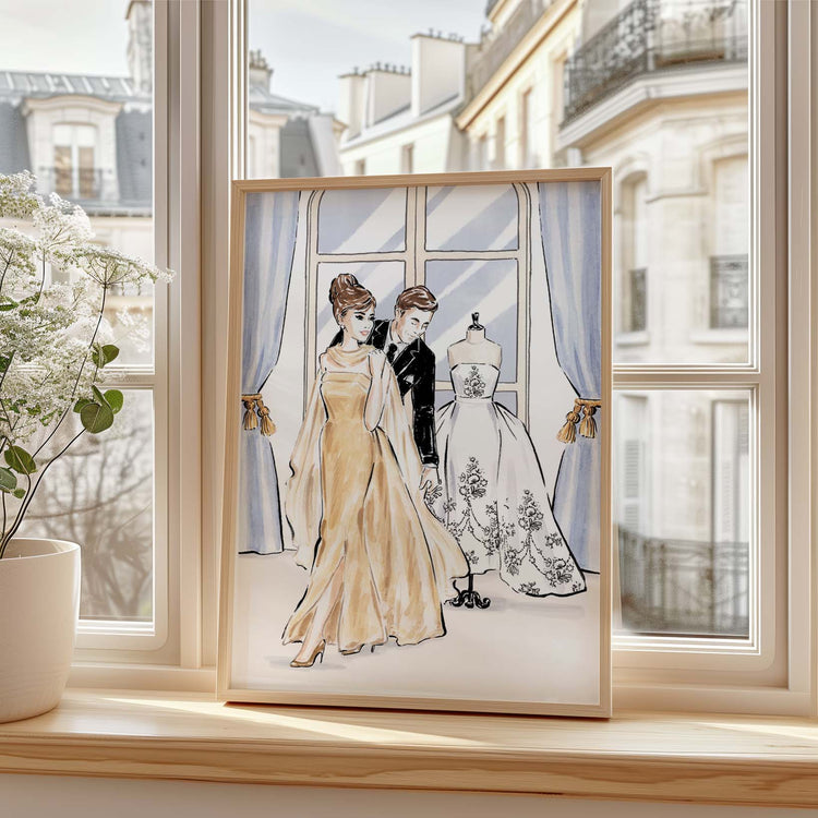High-quality art print of watercolour illustration 'Audrey Hepburn & Hubert de Givenchy'. Frame not included.